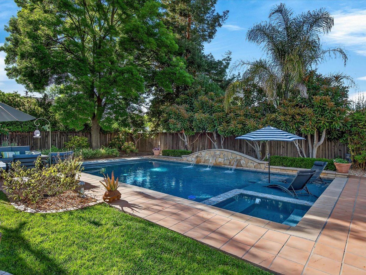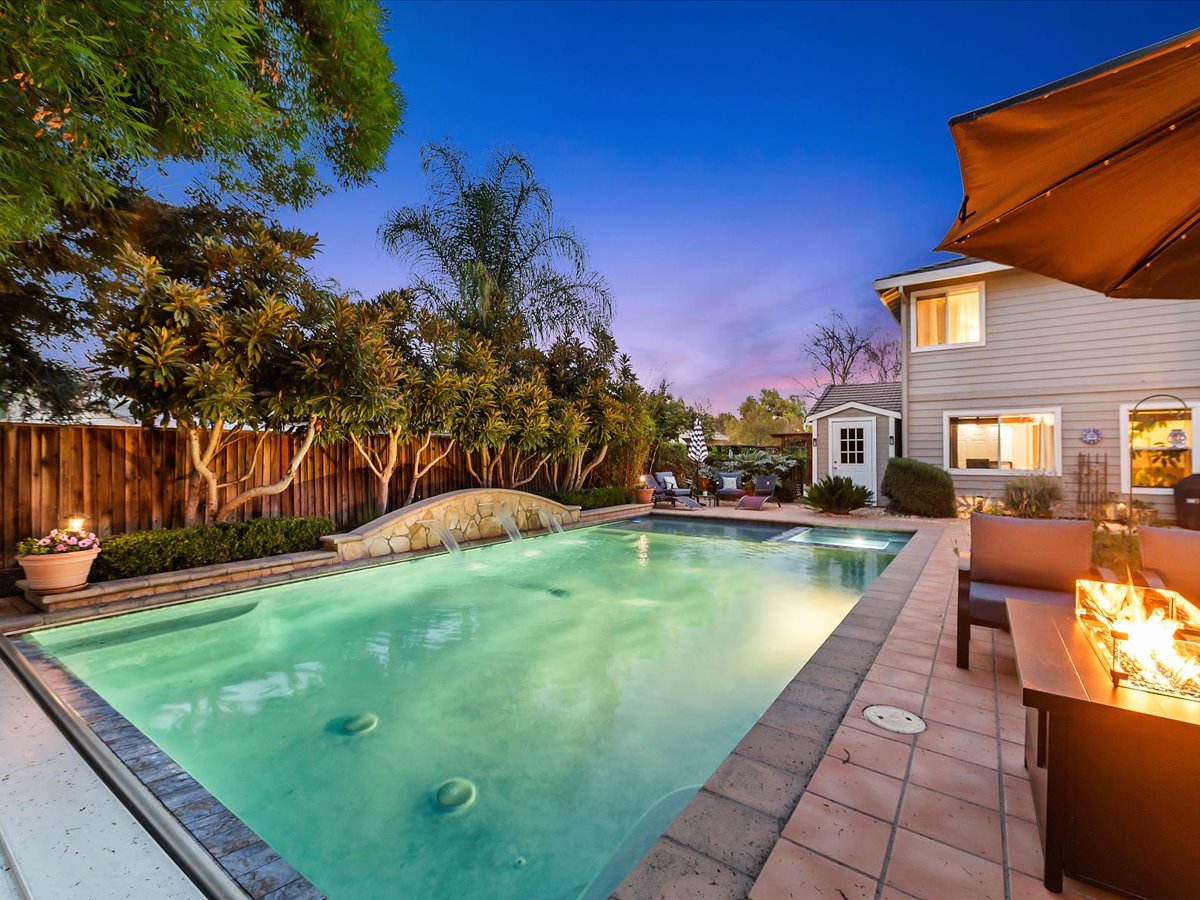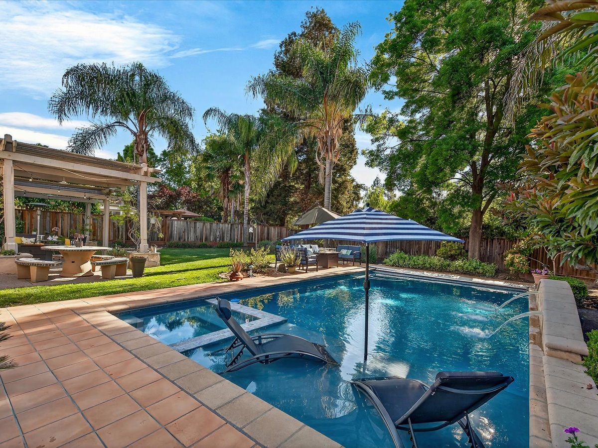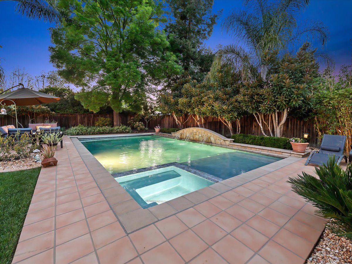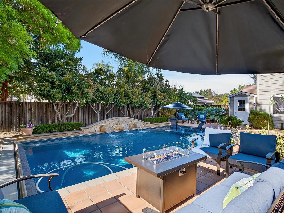 Gracious Residence featuring 4 Bedrooms, 3 Bathrooms with a Spellbinding Backyard featuring a remodeled swimming pool, spa, patio and arbor. Side yard access and charming shed offer great storage capabilities with a three-car garage. A gracious entry with vaulted ceilings and hardwood flooring flow throughout the first floor. Formal living and dining have lots of light and offer the perfect place to share holidays with friends and family. Bedroom or office with full bathroom on the lower level. Fully remodeled kitchen with quartz slab counters, new cabinetry and a stainless-steel suite of appliances. New auto-programable blinds in casual spaces offer ease. Enjoy backyard views and nearby dining niche with built-in bench and garden window. The family room has a travertine fireplace. Ascend a handsome staircase to two well-appointed bedrooms with mutliple windows for cross ventilation, separated by guest bath with dual vanity. Retreat into the primary suite to recharge and renew. Shutters open up to morning sun and tree-lined views. Ensuite with marble vanity, dual euro sinks and large shower with built-in seating. Walk-in closets feature mirrored doors and custom storage with beauty and organization in mind.
