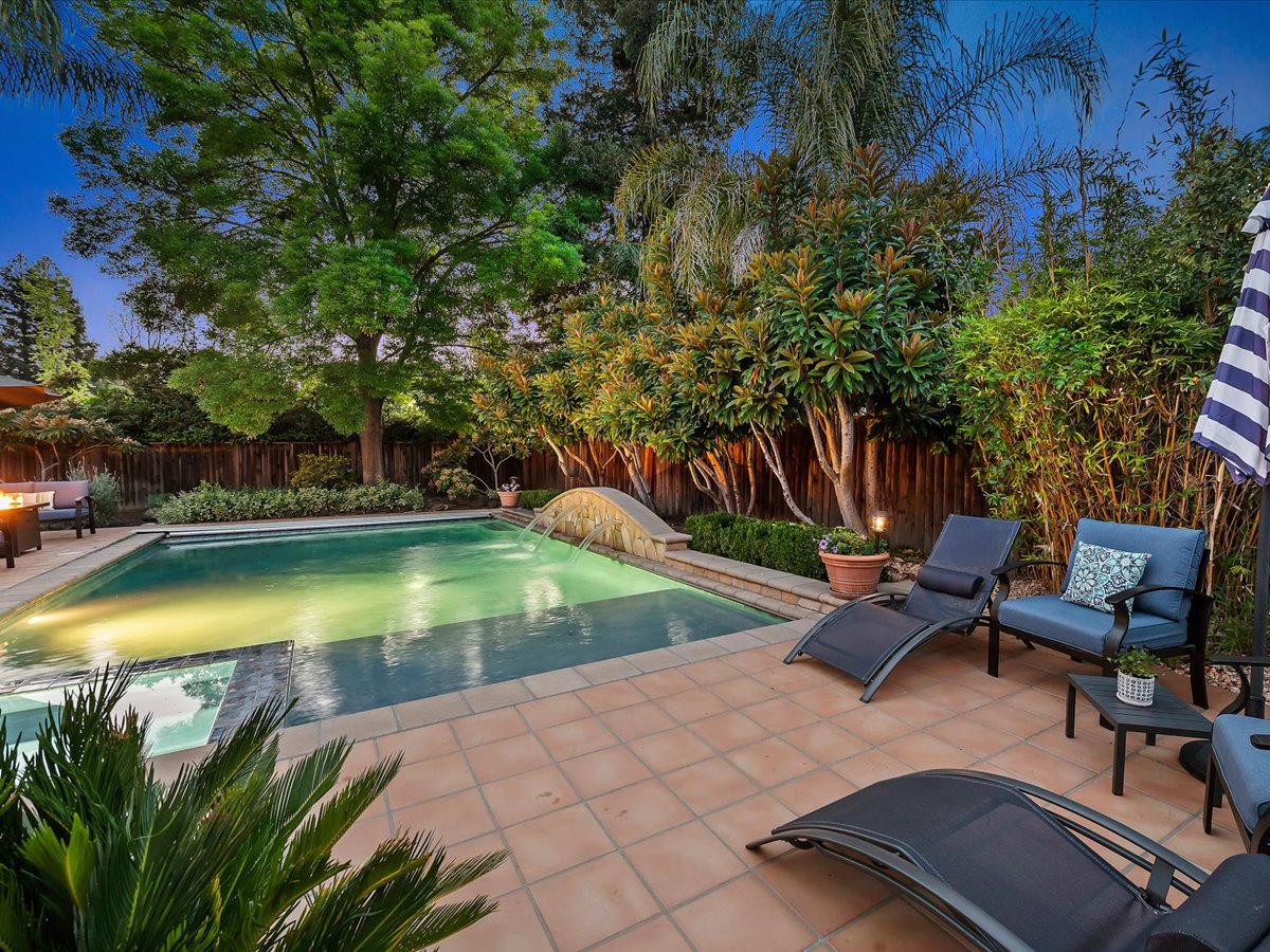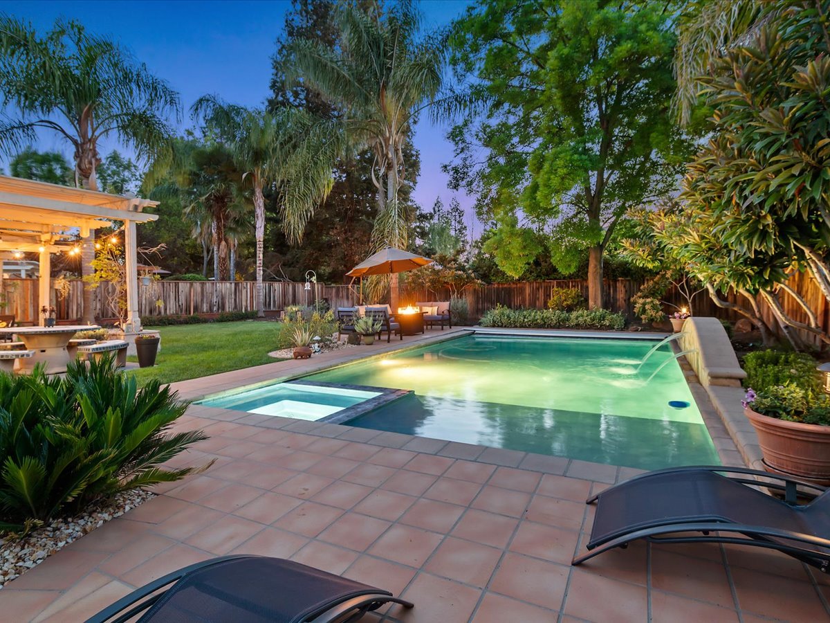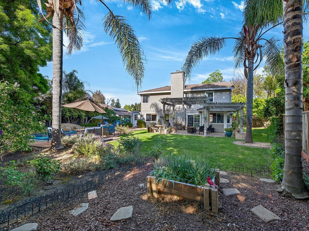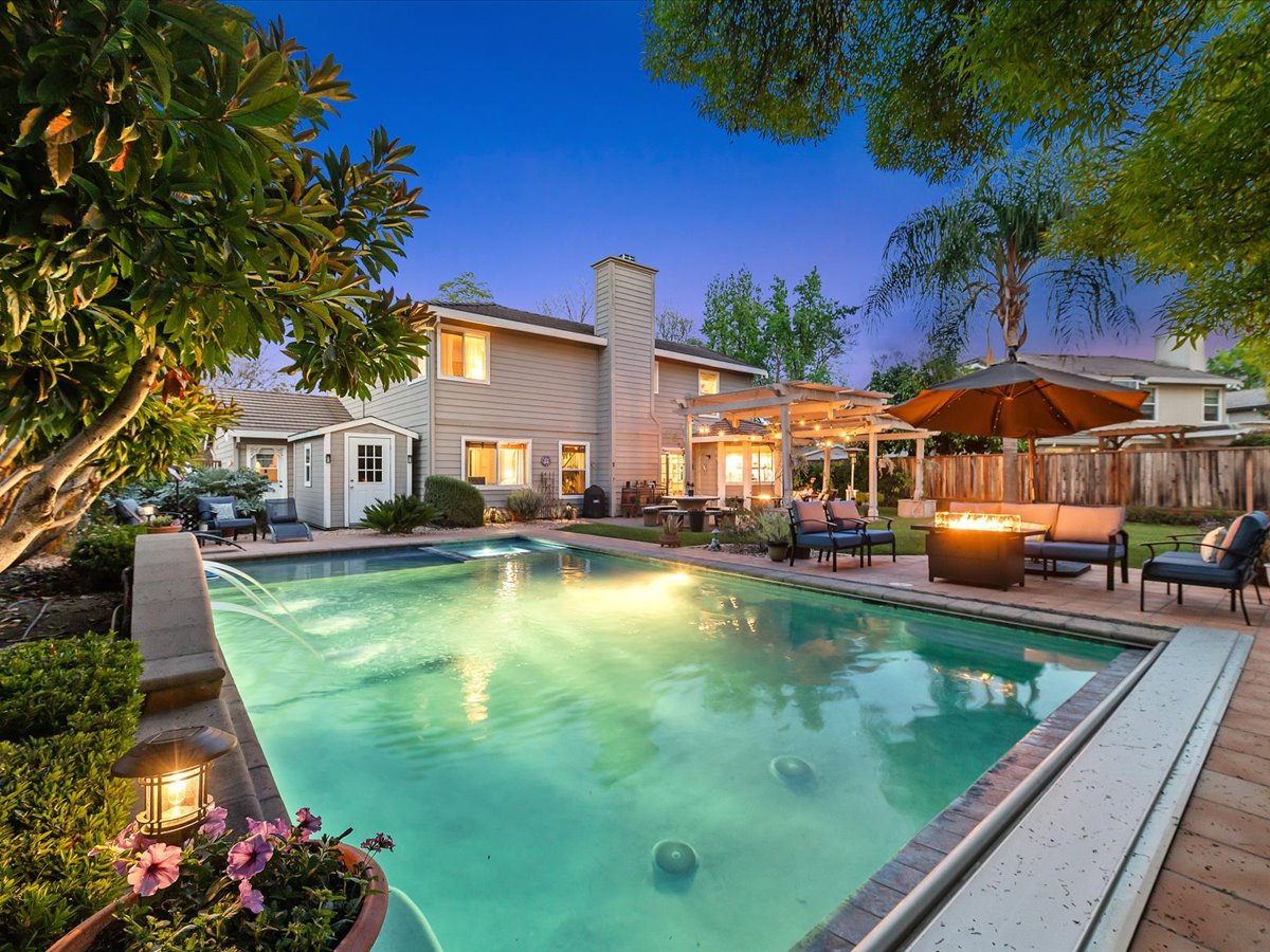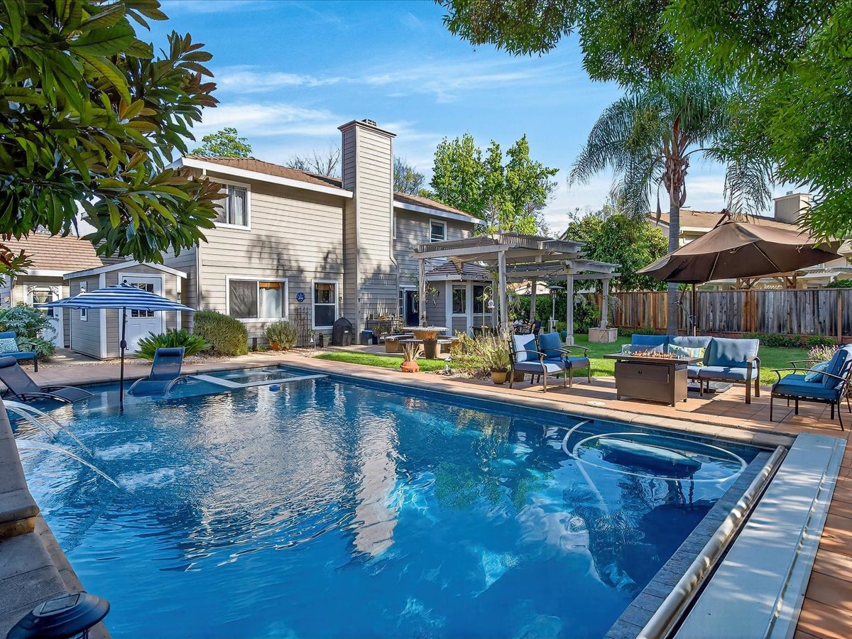 Gracious Residence featuring 4 Bedrooms, 3 Bathrooms with a Spellbinding Backyard featuring a remodeled swimming pool, spa, patio and arbor. Side yard access and charming shed offer great storage capabilities with a three-car garage. A gracious entry with vaulted ceilings and hardwood flooring flow throughout the first floor. Formal living and dining have lots of light and offer the perfect place to share holidays with friends and family. Bedroom or office with full bathroom on the lower level. Fully remodeled kitchen with quartz slab counters, new cabinetry and a stainless-steel suite of appliances. New auto-programable blinds in casual spaces offer ease. Enjoy backyard views and nearby dining niche with built-in bench and garden window. The family room has a travertine fireplace. Ascend a handsome staircase to two well-appointed bedrooms with mutliple windows for cross ventilation, separated by guest bath with dual vanity. Retreat into the primary suite to recharge and renew. Shutters open up to morning sun and tree-lined views. Ensuite with marble vanity, dual euro sinks and large shower with built-in seating. Walk-in closets feature mirrored doors and custom storage with beauty and organization in mind.