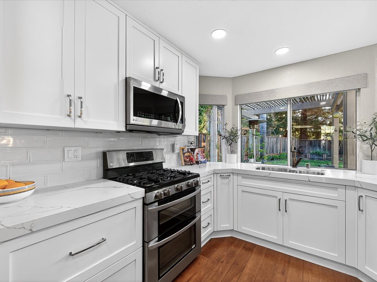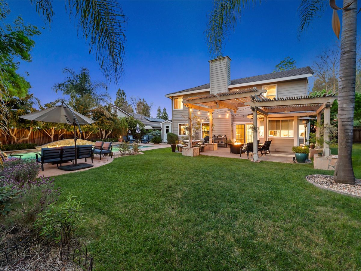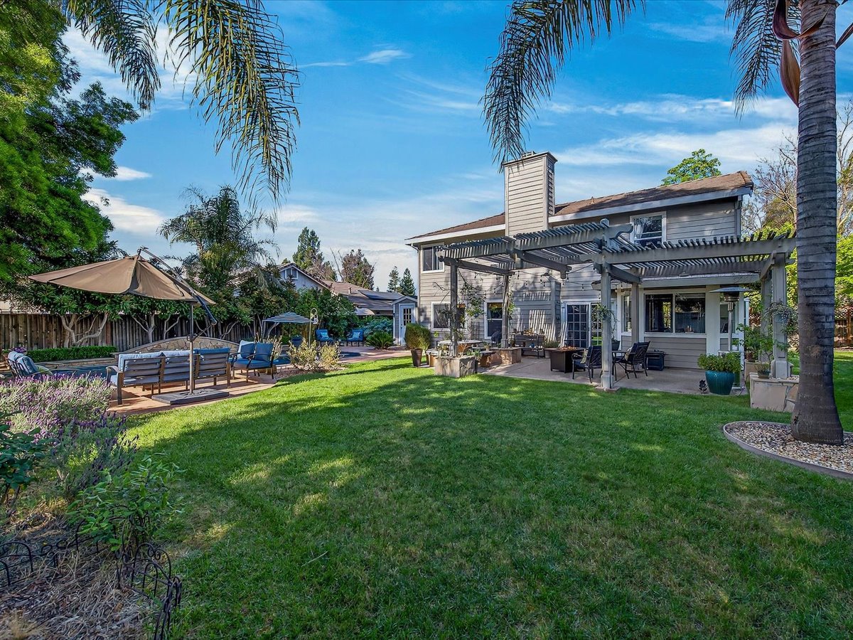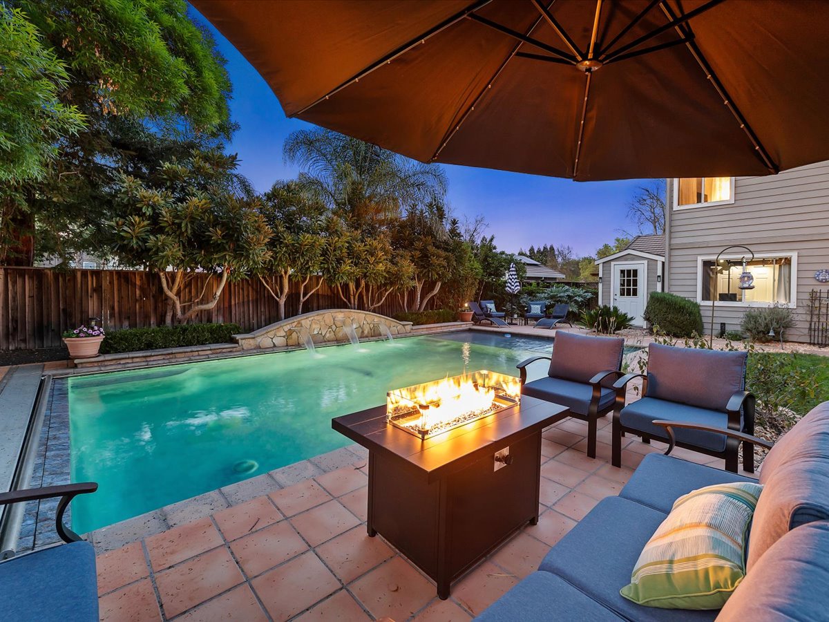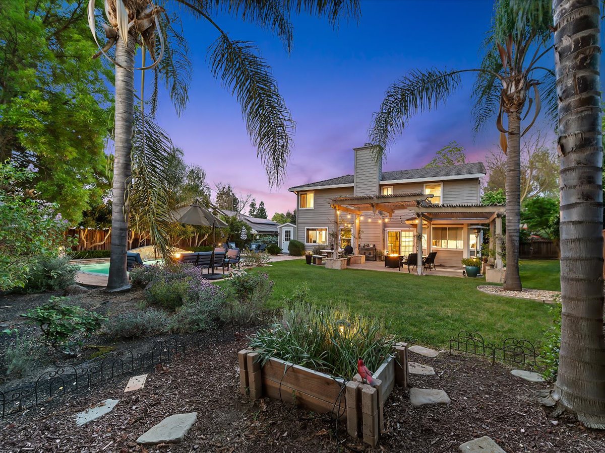 Gracious Residence featuring 4 Bedrooms, 3 Bathrooms with a Spellbinding Backyard featuring a remodeled swimming pool, spa, patio and arbor. Side yard access and charming shed offer great storage capabilities with a three-car garage. A gracious entry with vaulted ceilings and hardwood flooring flow throughout the first floor. Formal living and dining have lots of light and offer the perfect place to share holidays with friends and family. Bedroom or office with full bathroom on the lower level. Fully remodeled kitchen with quartz slab counters, new cabinetry and a stainless-steel suite of appliances. New auto-programable blinds in casual spaces offer ease. Enjoy backyard views and nearby dining niche with built-in bench and garden window. The family room has a travertine fireplace. Ascend a handsome staircase to two well-appointed bedrooms with mutliple windows for cross ventilation, separated by guest bath with dual vanity. Retreat into the primary suite to recharge and renew. Shutters open up to morning sun and tree-lined views. Ensuite with marble vanity, dual euro sinks and large shower with built-in seating. Walk-in closets feature mirrored doors and custom storage with beauty and organization in mind.