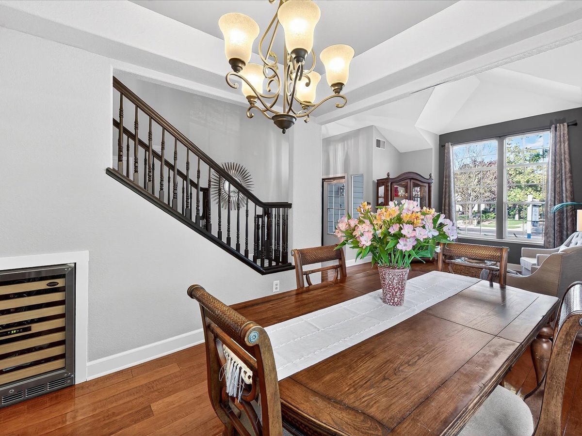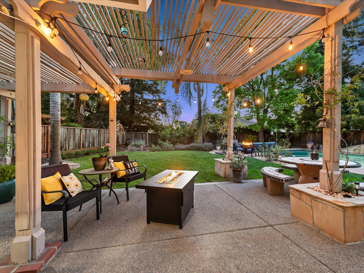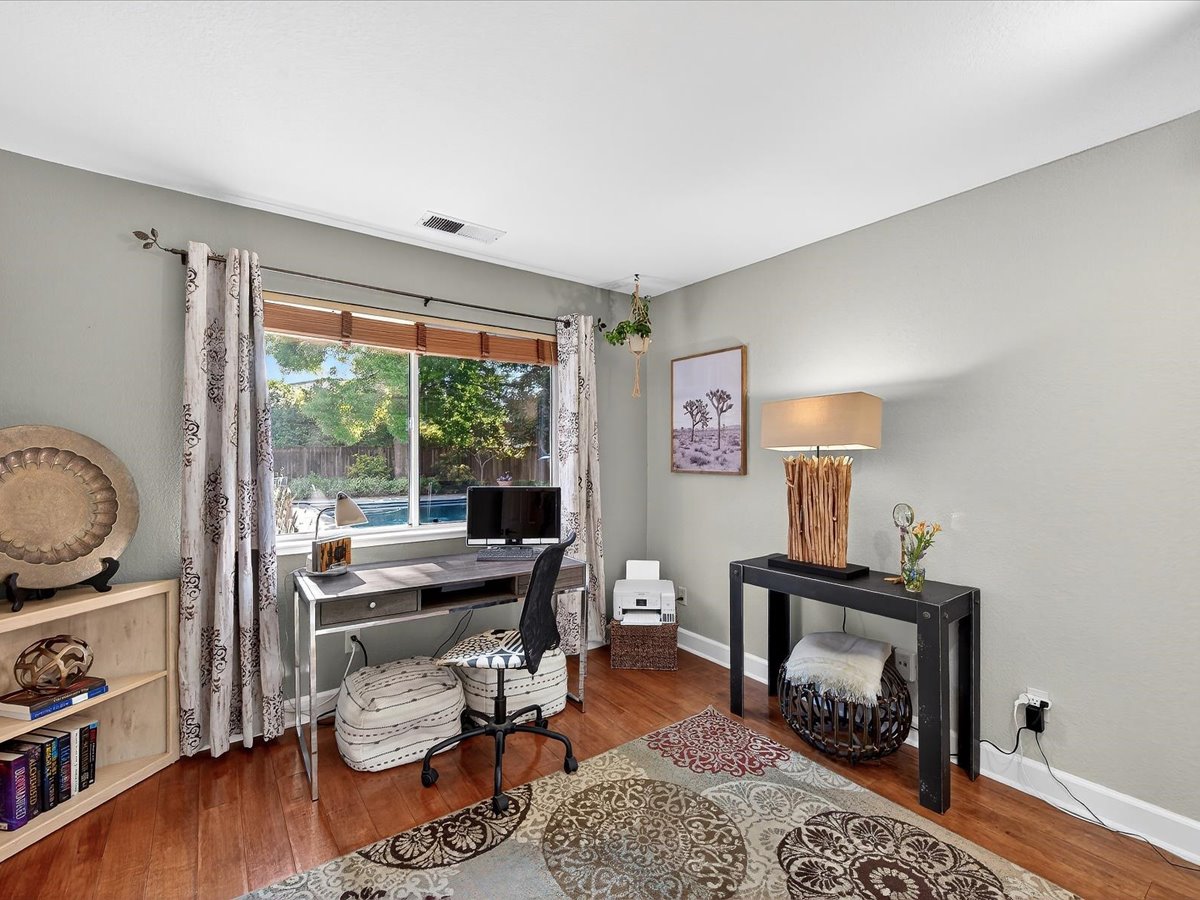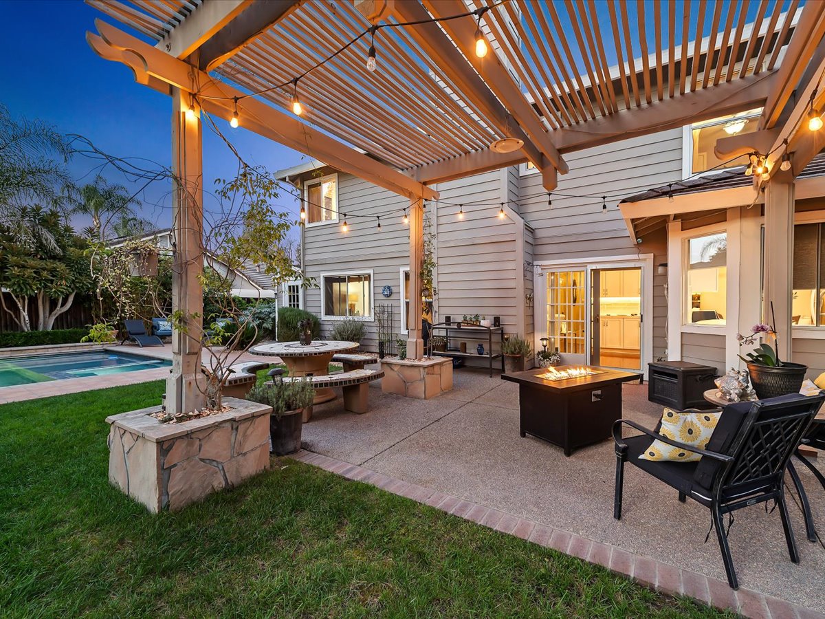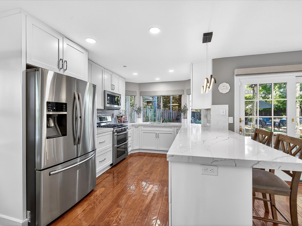Gracious Residence featuring 4 Bedrooms, 3 Bathrooms with a Spellbinding Backyard featuring a remodeled swimming pool, spa, patio and arbor. Side yard access and charming shed offer great storage capabilities with a three-car garage. A gracious entry with vaulted ceilings and hardwood flooring flow throughout the first floor. Formal living and dining have lots of light and offer the perfect place to share holidays with friends and family. Bedroom or office with full bathroom on the lower level. Fully remodeled kitchen with quartz slab counters, new cabinetry and a stainless-steel suite of appliances. New auto-programable blinds in casual spaces offer ease. Enjoy backyard views and nearby dining niche with built-in bench and garden window. The family room has a travertine fireplace. Ascend a handsome staircase to two well-appointed bedrooms with mutliple windows for cross ventilation, separated by guest bath with dual vanity. Retreat into the primary suite to recharge and renew. Shutters open up to morning sun and tree-lined views. Ensuite with marble vanity, dual euro sinks and large shower with built-in seating. Walk-in closets feature mirrored doors and custom storage with beauty and organization in mind.