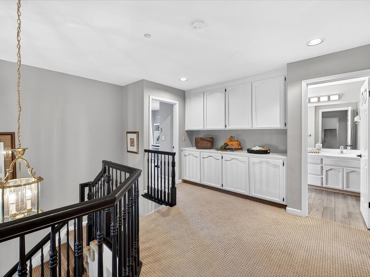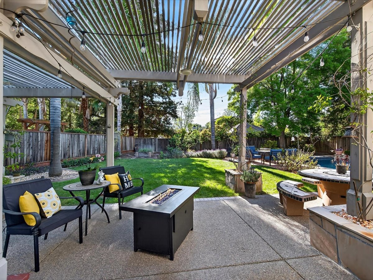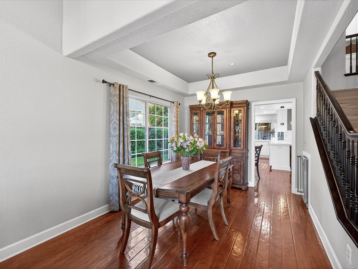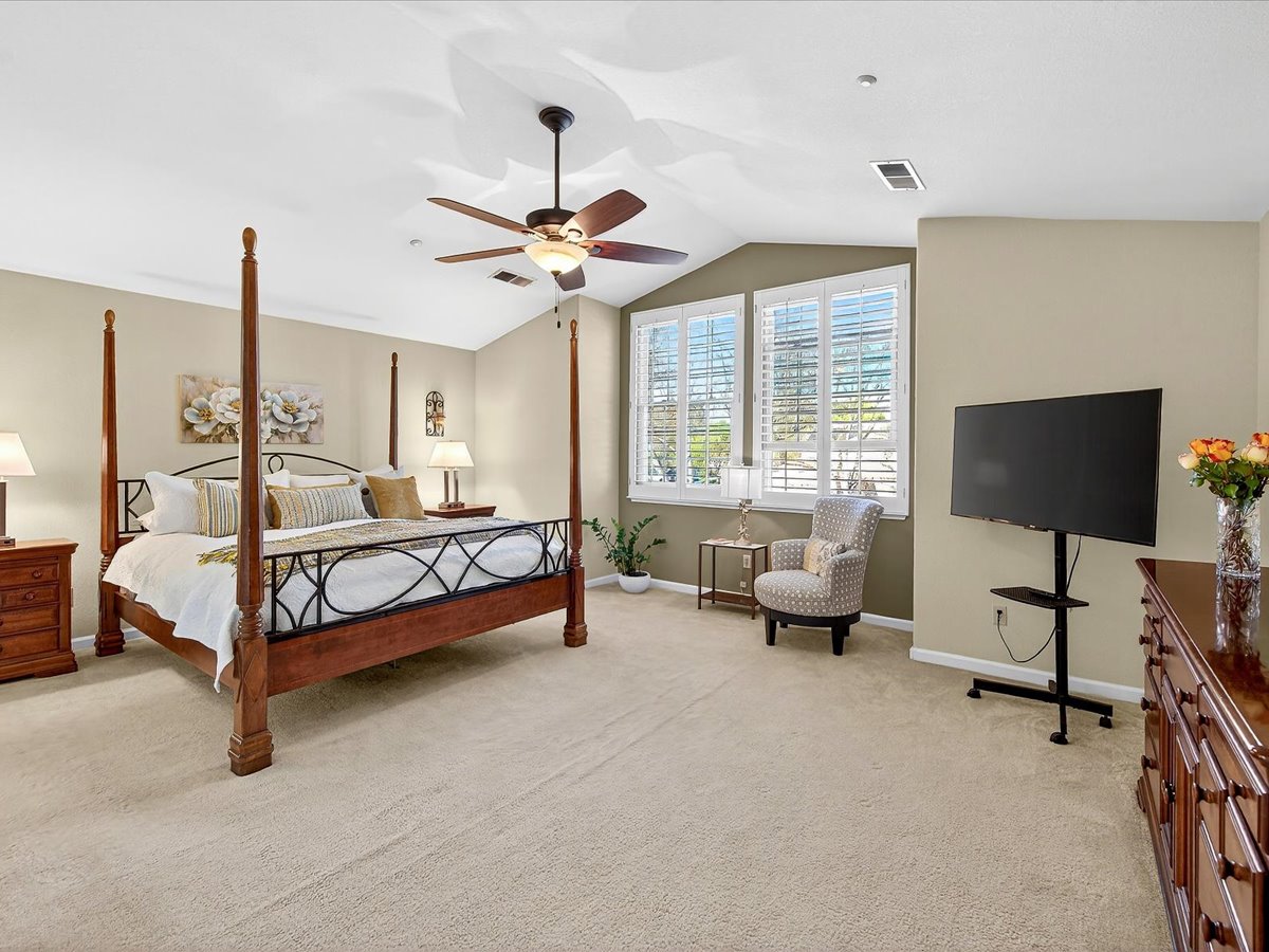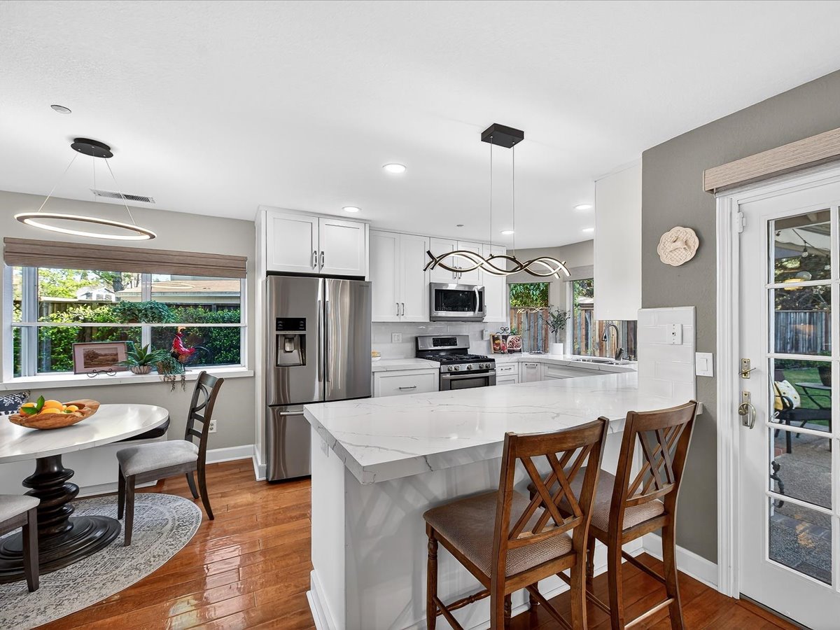 Gracious Residence featuring 4 Bedrooms, 3 Bathrooms with a Spellbinding Backyard featuring a remodeled swimming pool, spa, patio and arbor. Side yard access and charming shed offer great storage capabilities with a three-car garage. A gracious entry with vaulted ceilings and hardwood flooring flow throughout the first floor. Formal living and dining have lots of light and offer the perfect place to share holidays with friends and family. Bedroom or office with full bathroom on the lower level. Fully remodeled kitchen with quartz slab counters, new cabinetry and a stainless-steel suite of appliances. New auto-programable blinds in casual spaces offer ease. Enjoy backyard views and nearby dining niche with built-in bench and garden window. The family room has a travertine fireplace. Ascend a handsome staircase to two well-appointed bedrooms with mutliple windows for cross ventilation, separated by guest bath with dual vanity. Retreat into the primary suite to recharge and renew. Shutters open up to morning sun and tree-lined views. Ensuite with marble vanity, dual euro sinks and large shower with built-in seating. Walk-in closets feature mirrored doors and custom storage with beauty and organization in mind.
