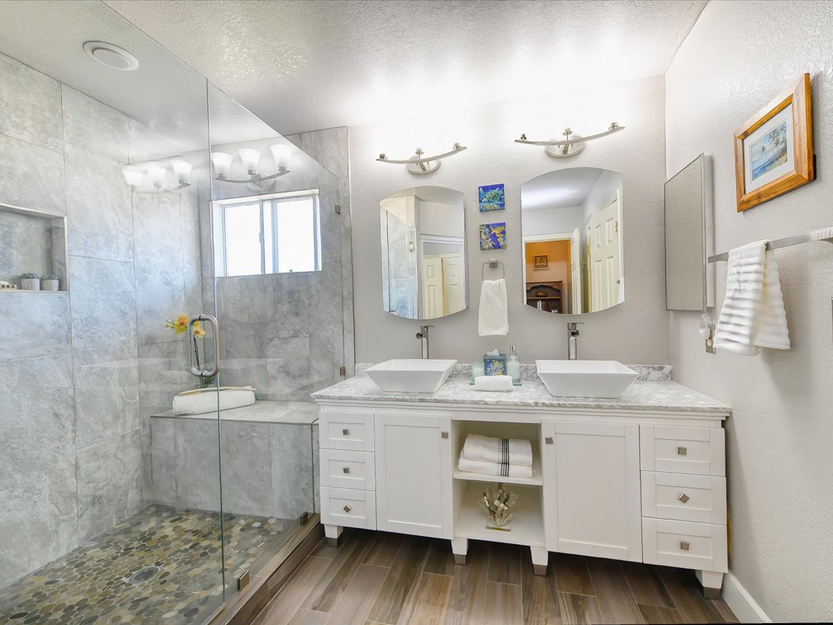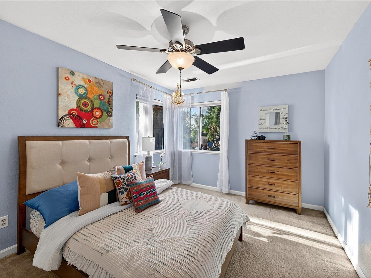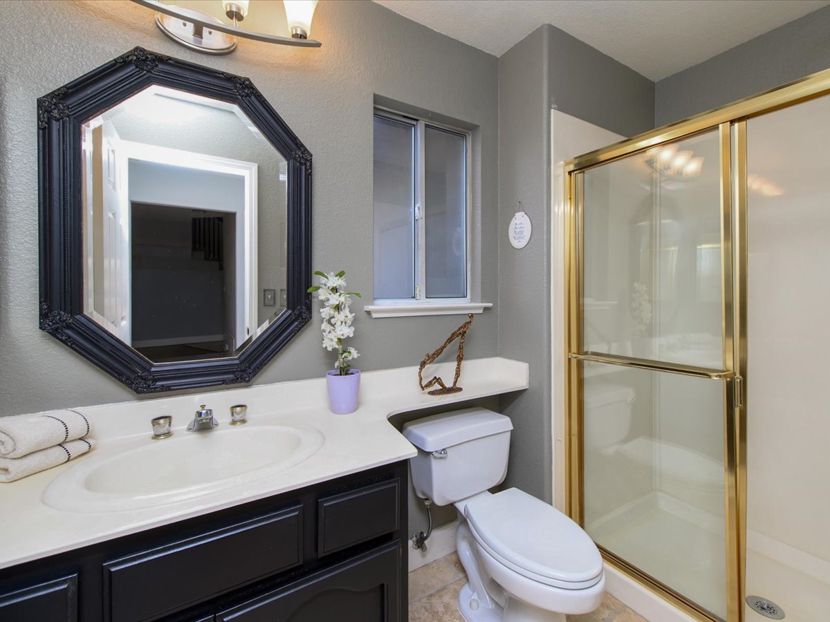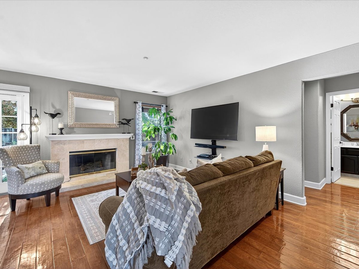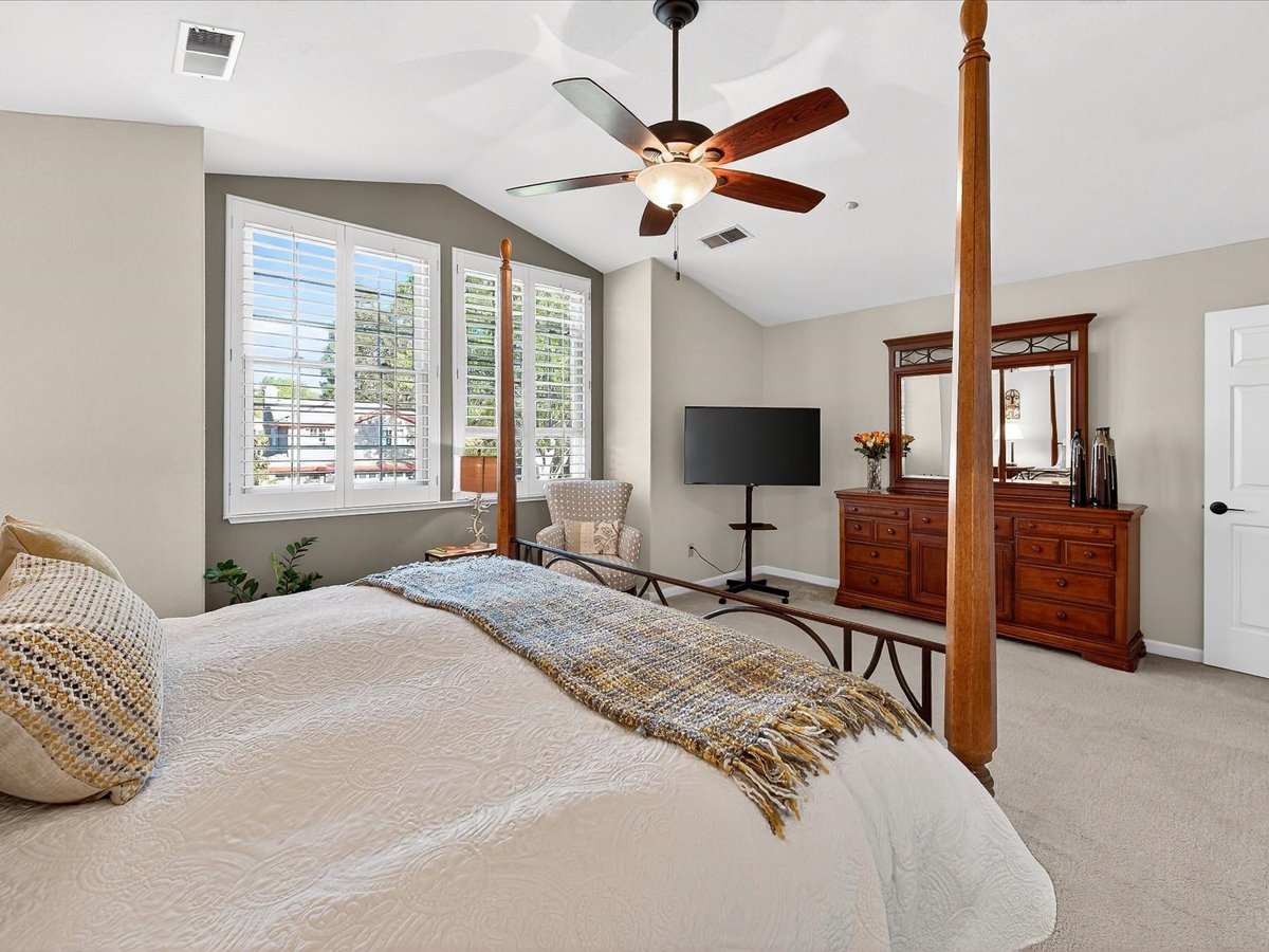 Gracious Residence featuring 4 Bedrooms, 3 Bathrooms with a Spellbinding Backyard featuring a remodeled swimming pool, spa, patio and arbor. Side yard access and charming shed offer great storage capabilities with a three-car garage. A gracious entry with vaulted ceilings and hardwood flooring flow throughout the first floor. Formal living and dining have lots of light and offer the perfect place to share holidays with friends and family. Bedroom or office with full bathroom on the lower level. Fully remodeled kitchen with quartz slab counters, new cabinetry and a stainless-steel suite of appliances. New auto-programable blinds in casual spaces offer ease. Enjoy backyard views and nearby dining niche with built-in bench and garden window. The family room has a travertine fireplace. Ascend a handsome staircase to two well-appointed bedrooms with mutliple windows for cross ventilation, separated by guest bath with dual vanity. Retreat into the primary suite to recharge and renew. Shutters open up to morning sun and tree-lined views. Ensuite with marble vanity, dual euro sinks and large shower with built-in seating. Walk-in closets feature mirrored doors and custom storage with beauty and organization in mind.